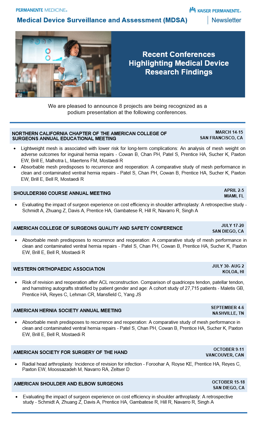The Kaiser Permanente (KP) Medical Device Surveillance and Assessment mission is to improve the quality of surgical care provided to KP members program-wide. By partnering with surgeons and leveraging integrated data systems, the Registries evaluate and monitor patient outcomes, new and existing technologies, and identify and facilitate implementation of clinical best practices applying advanced statistical analyses.